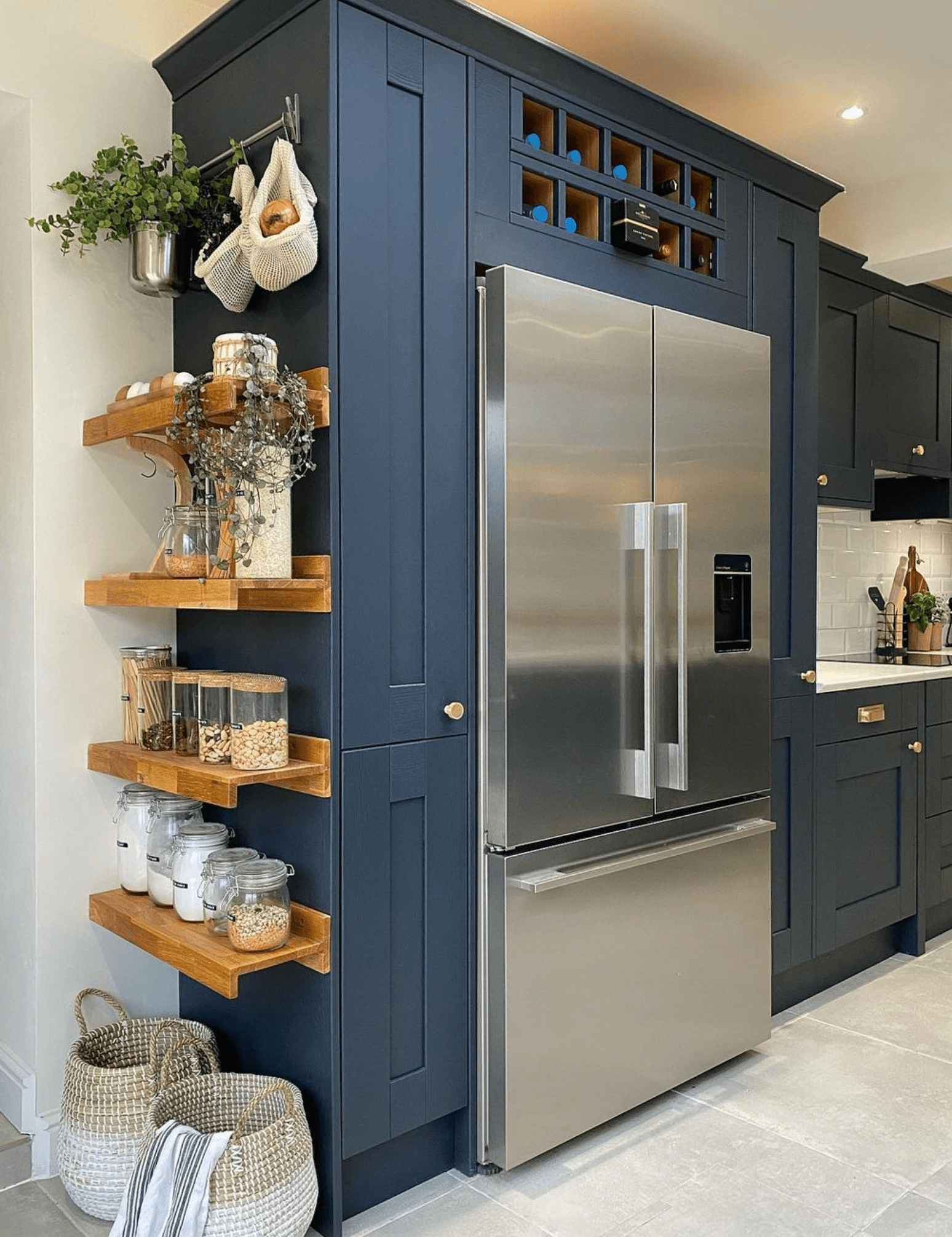Часто ми забуваємо про простір у висоту, а дарма! Високі навісні шафи до стелі – чудове рішення для зберігання речей, якими ви користуєтеся не так часто (святковий посуд, запаси консервації, дрібна побутова техніка). На верхні полиці відкритих стелажів можна поставити красиві банки з сипучими продуктами або декоративні елементи.